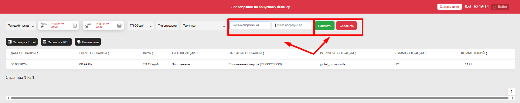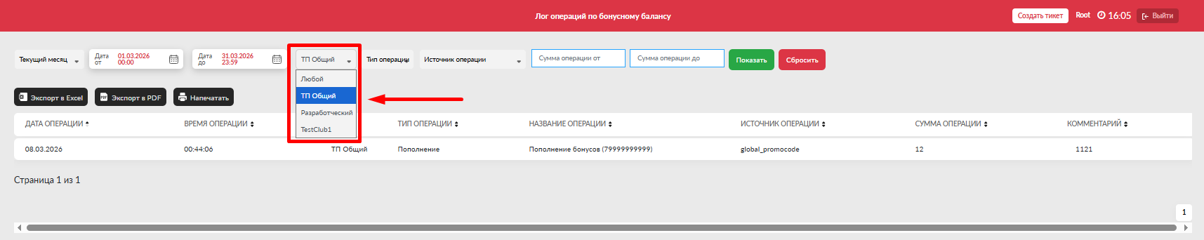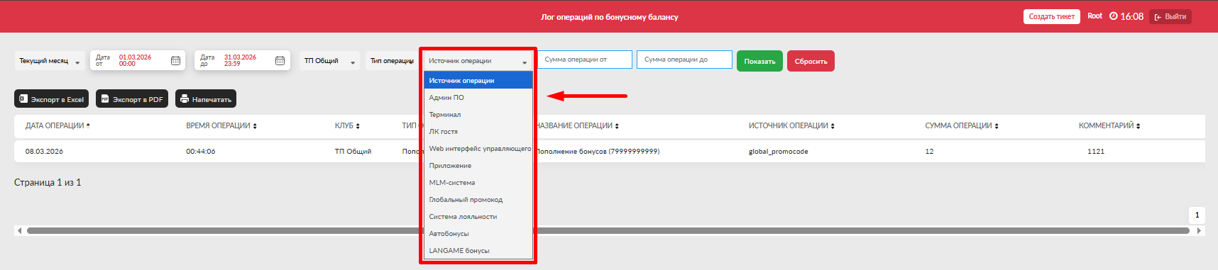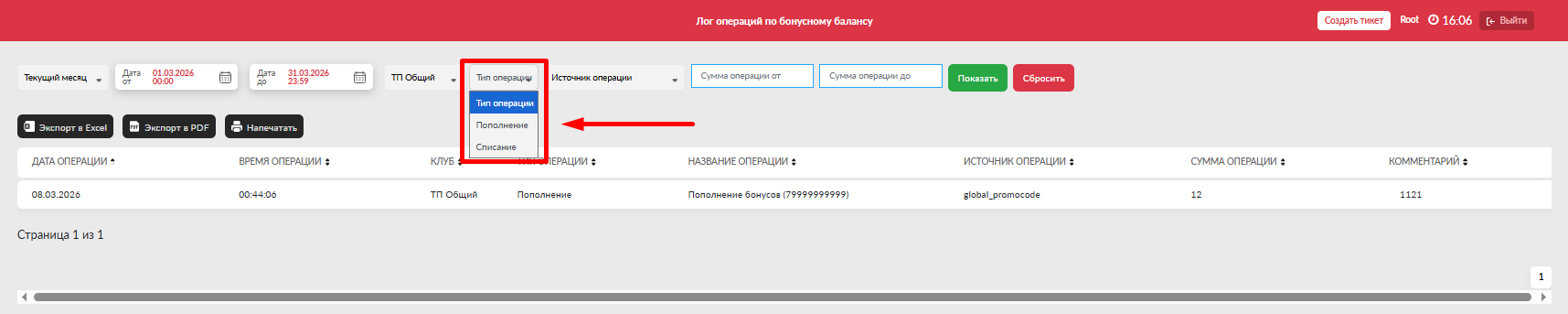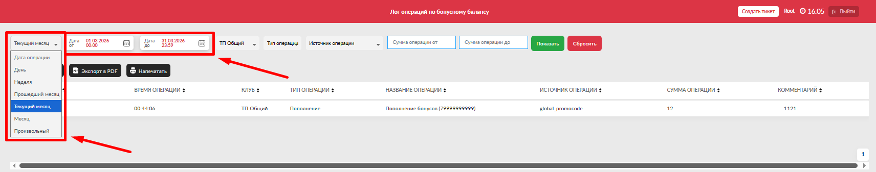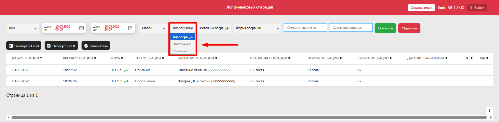 - Дата до (включительно) - выбрать дату до для просмотра операций по данную дату
