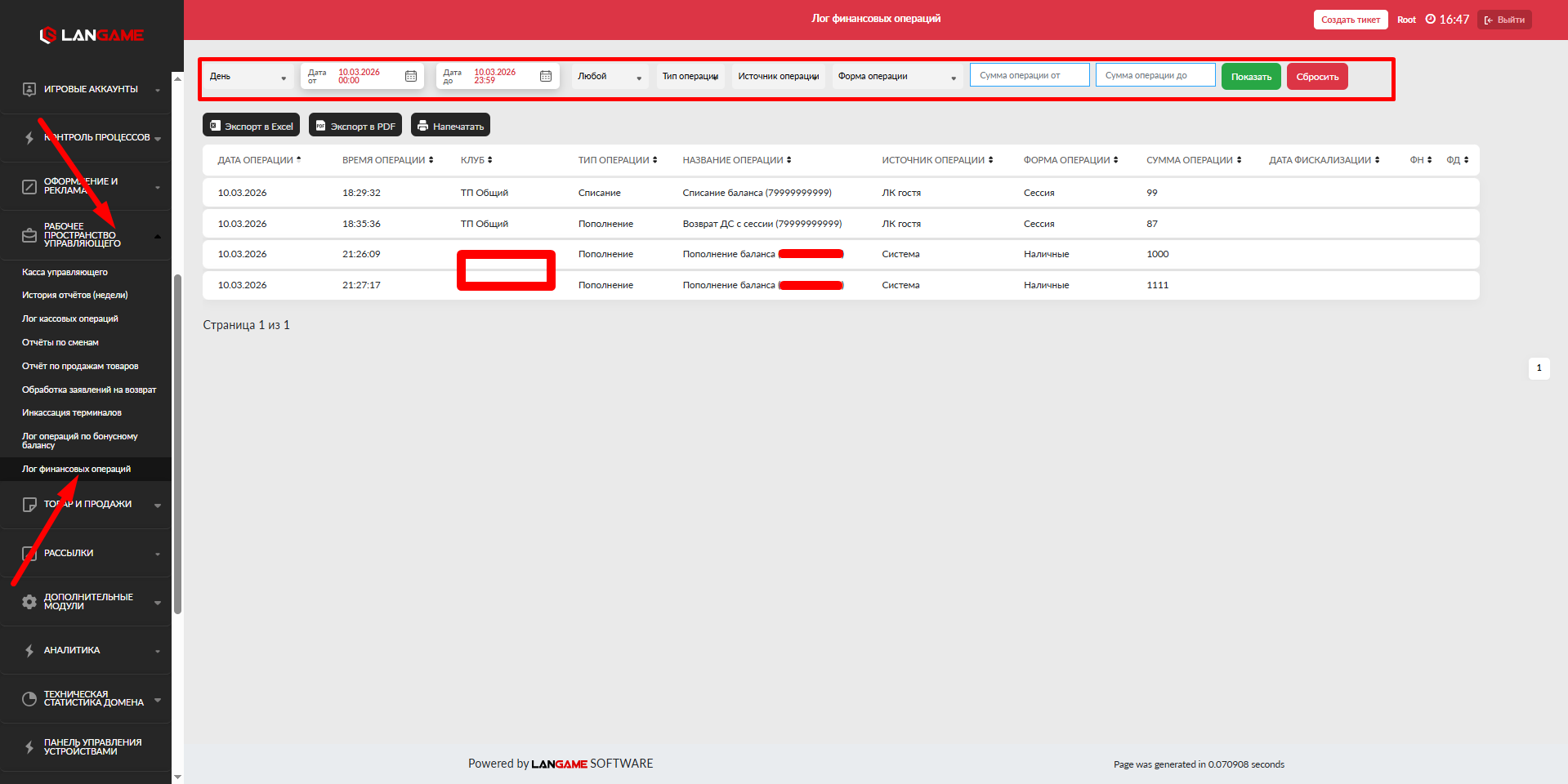 - Комментарий - при пополнении/списании к примеру с бонусной кассы Админ. ПО, Администратор может указывать комментарий