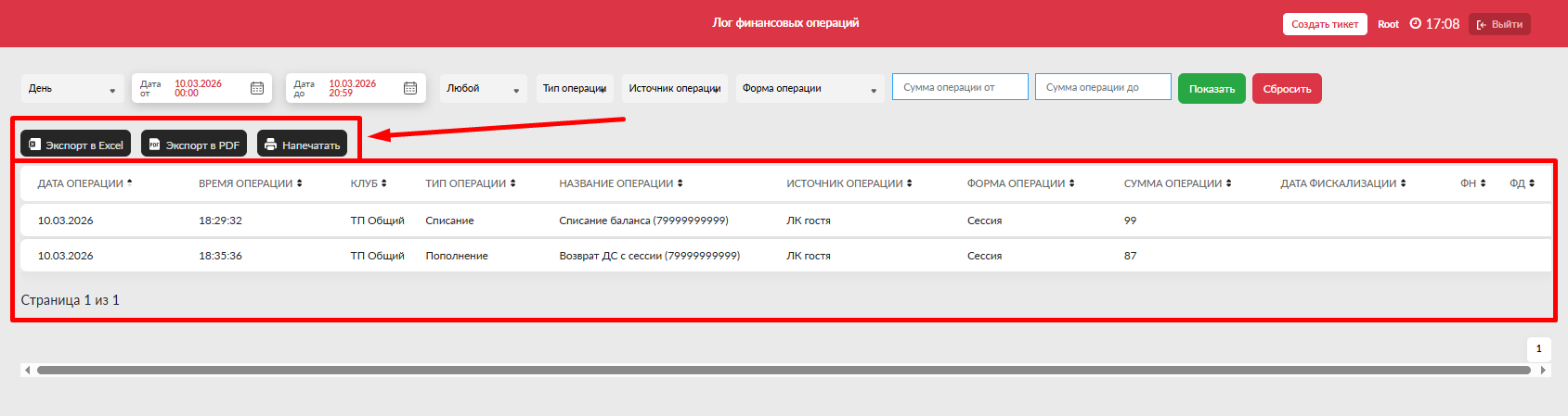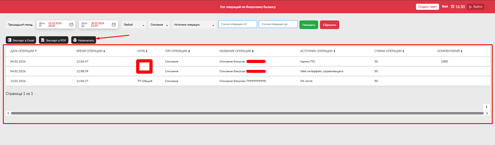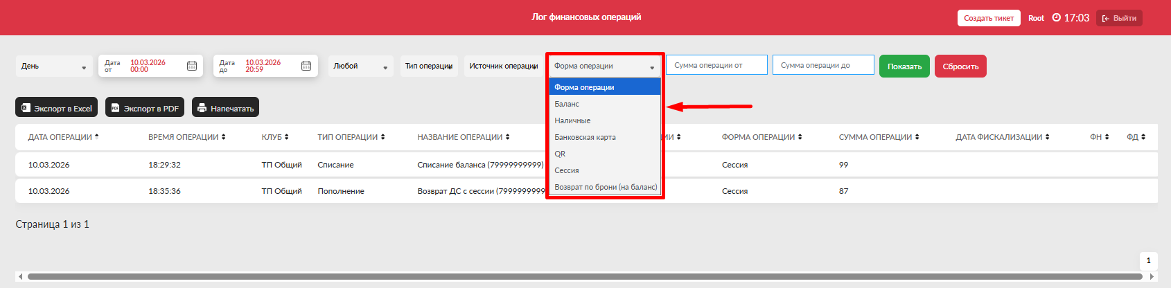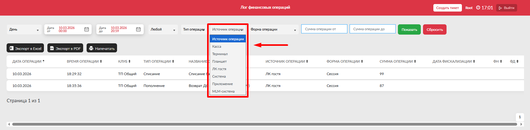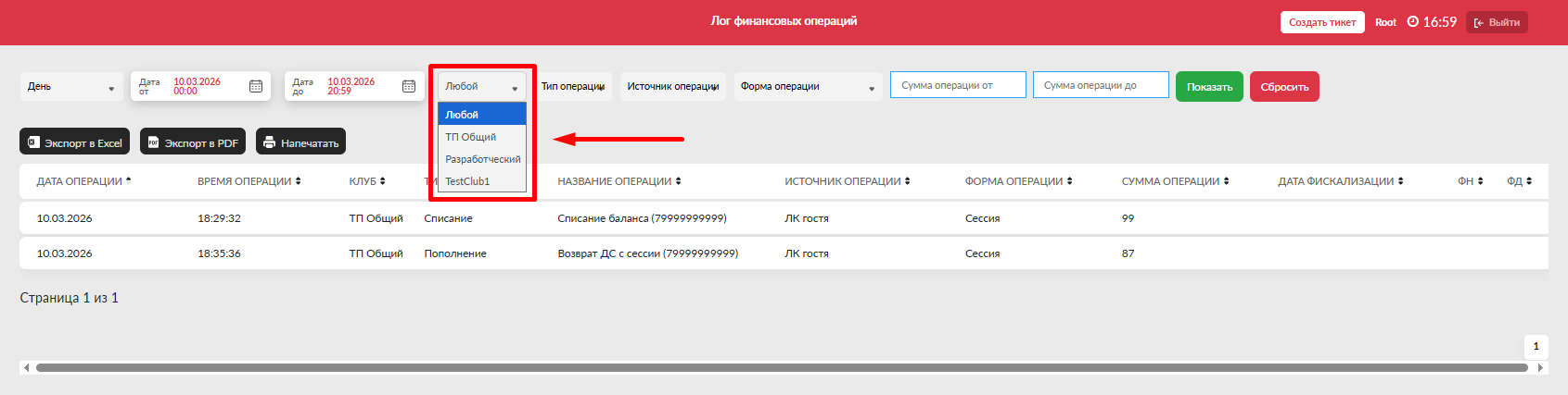 - Центр - отсортировать операции только по одному из клубов, если на домене их несколько