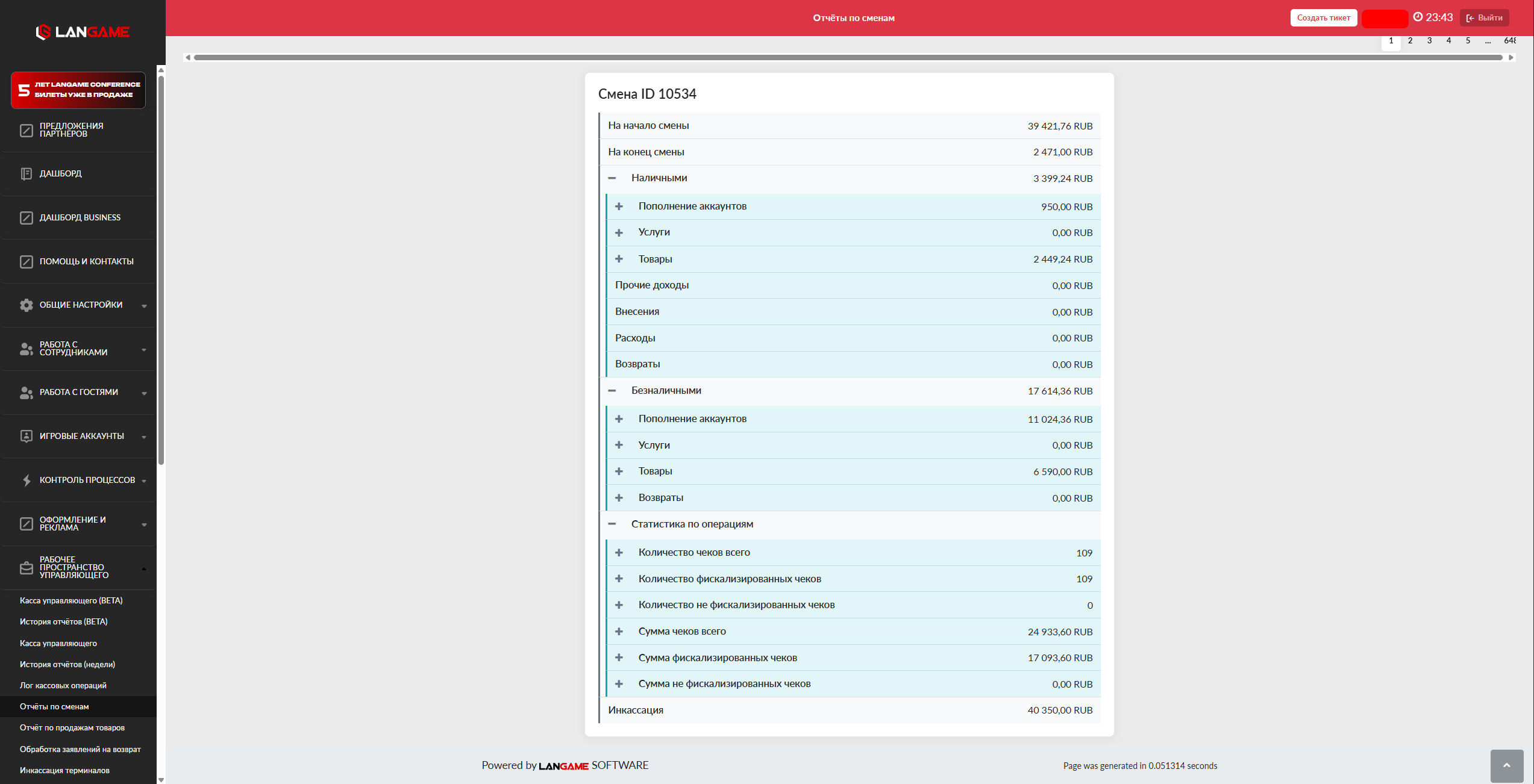 Указывает текущего администратора в смене, его логин, ФИО (указанное в анкете сотрудника) и дату открытия смены