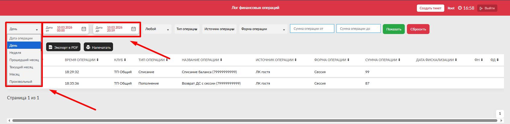 - Дата от (включительно) - выбрать дату от для просмотра операций с данной даты