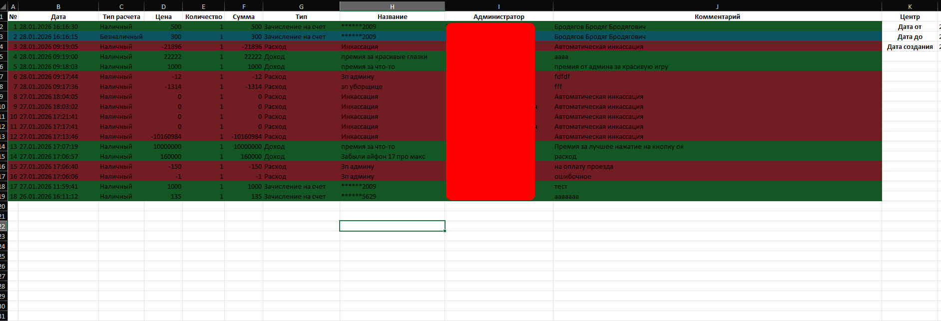 - Касса - через кассу Администратора