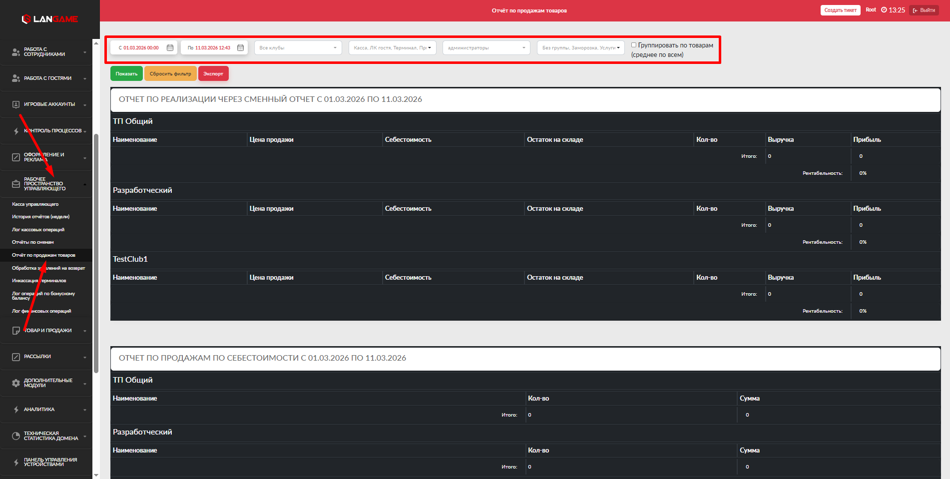 - Центр - в случае если на домене несколько клубов, то можно отфильтровать пополнения по клубам