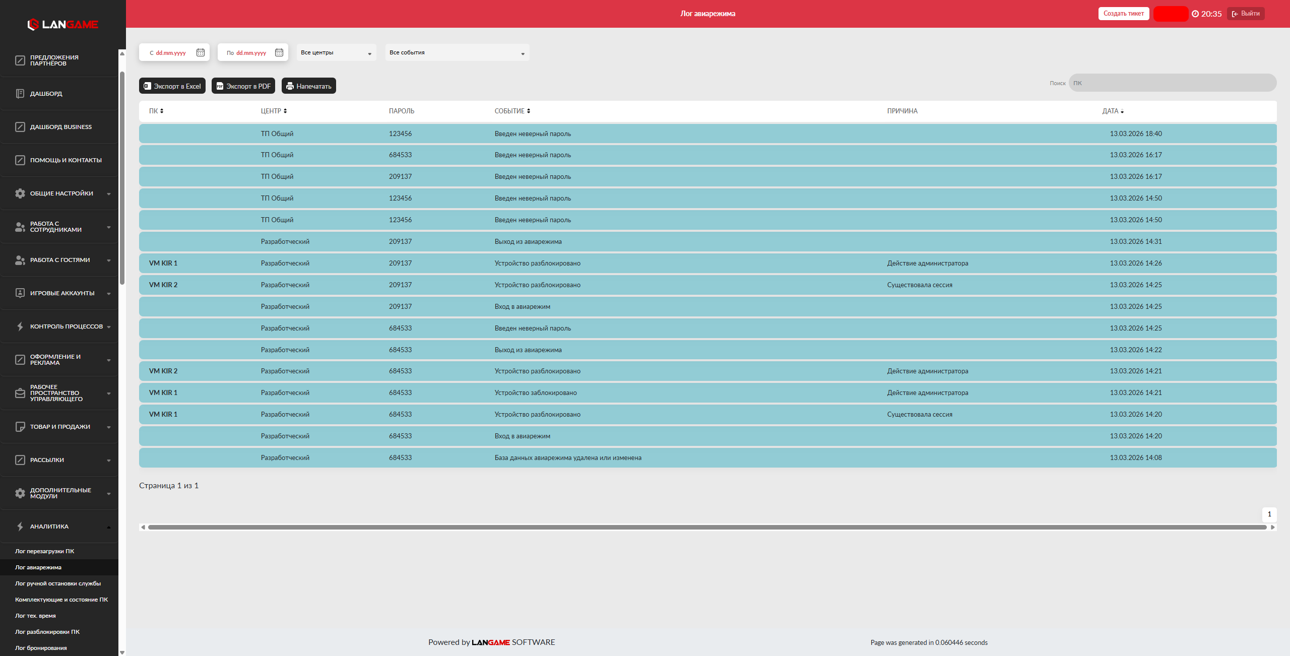Авиарежим длится до тех пор, пока не будет совершен выход из авиарежима в админ-ПО. При перезапуске админ-ПО оно вернется в авиарежим, и для входа необходимо ввести тот же пароль, который использовался для включения авиарежима.