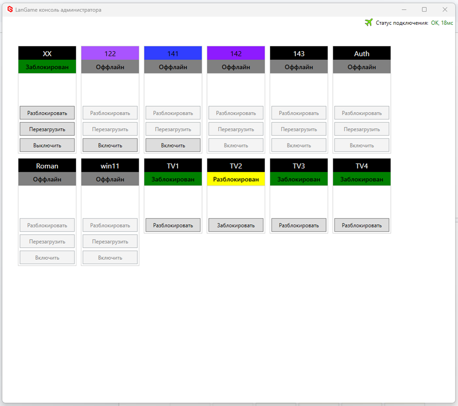 4. Админ-панель переходит в упрощенный интерфейс управления ПК, где отображаются ПК, их статус (заблокирован / разблокирован) и кнопки блокировки, разблокировки и перезагрузки ПК