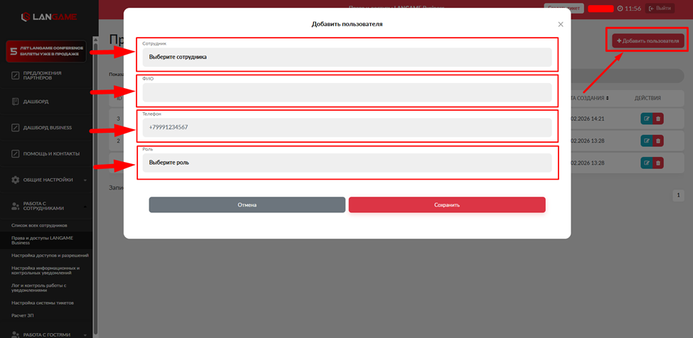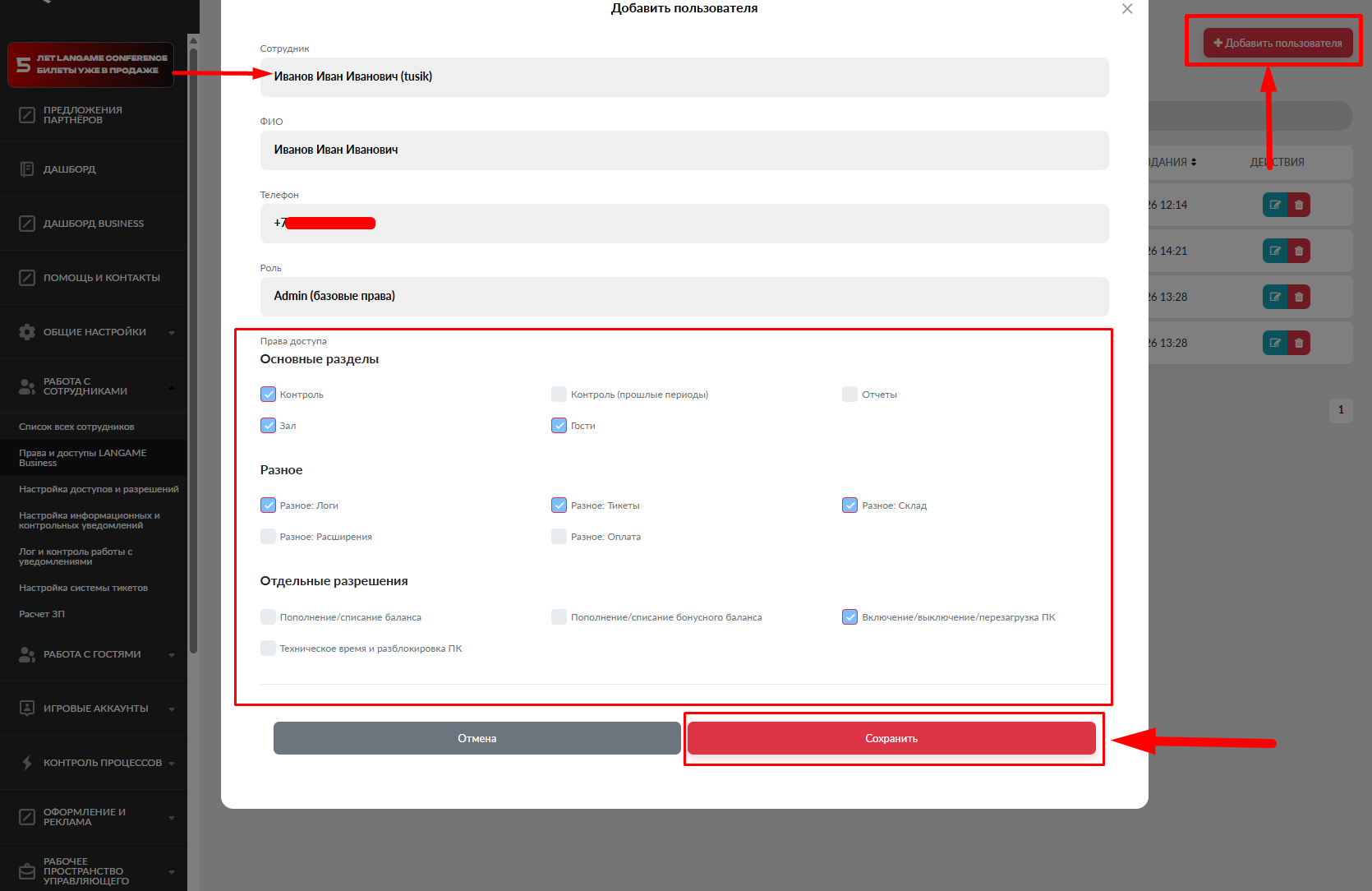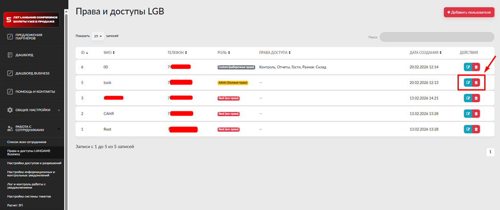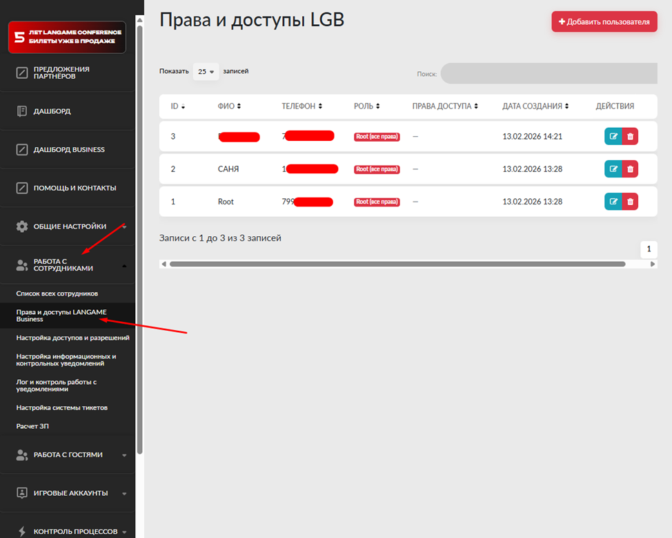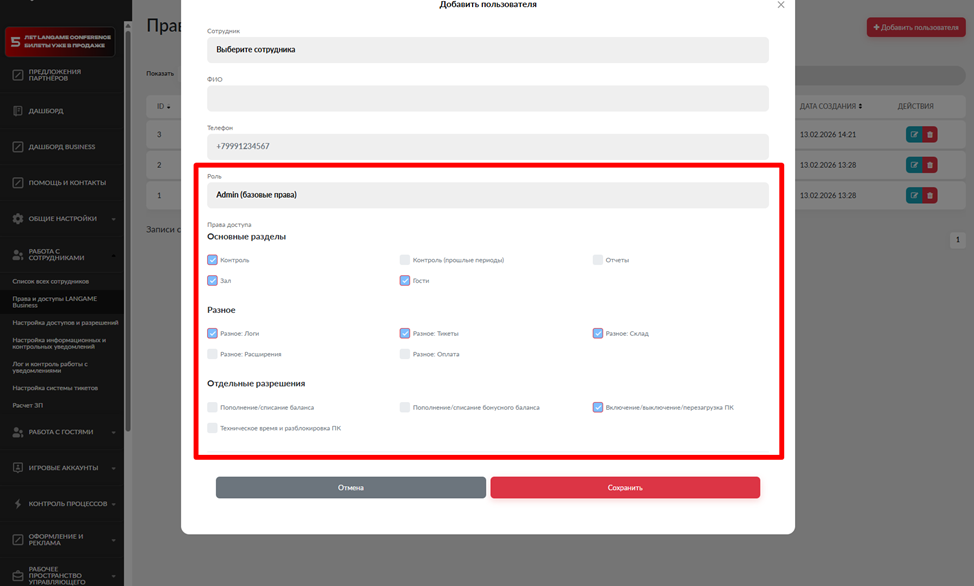 Настройка прав и доступов для сотрудника в приложении LGB
