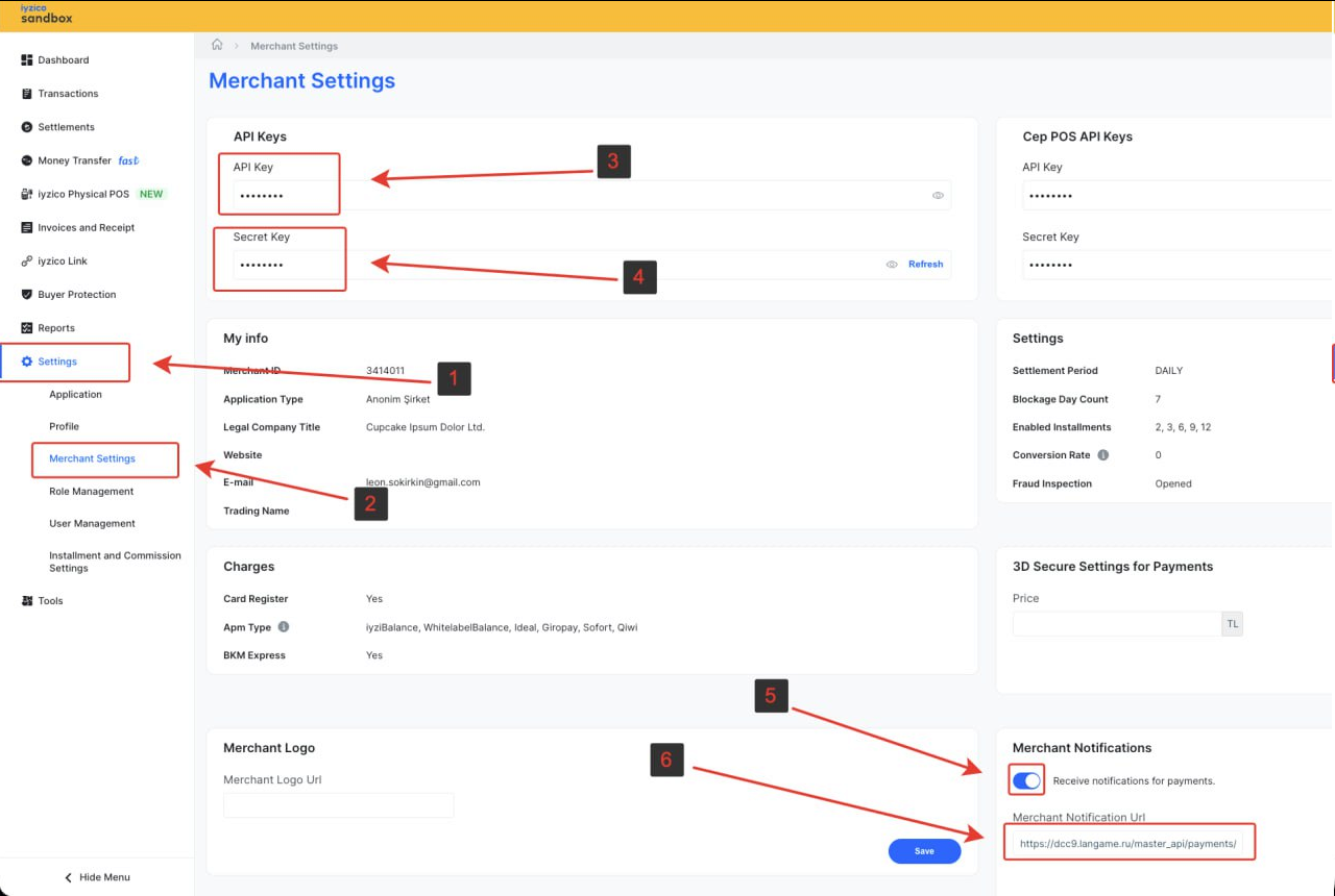 - Включить Merchant Notifications (5) и указать ссылку на вебхук (6) в формате https://домен/master_api/payments/iyzico/finish
