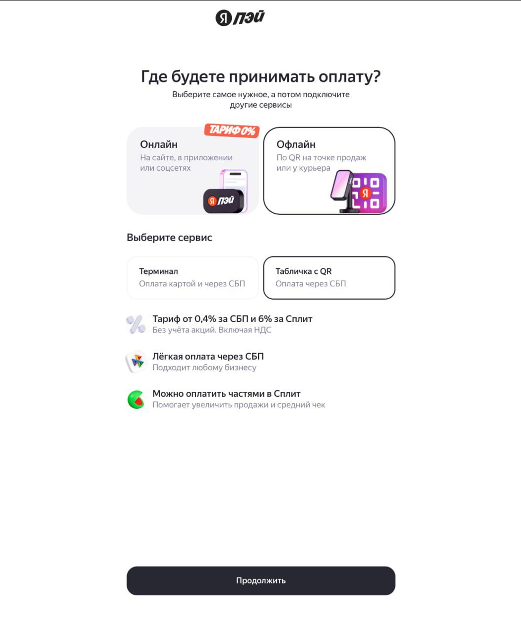 После авторизации выбираем "Офлайн", далее "табличка с QR" и нажимаем "продолжить"