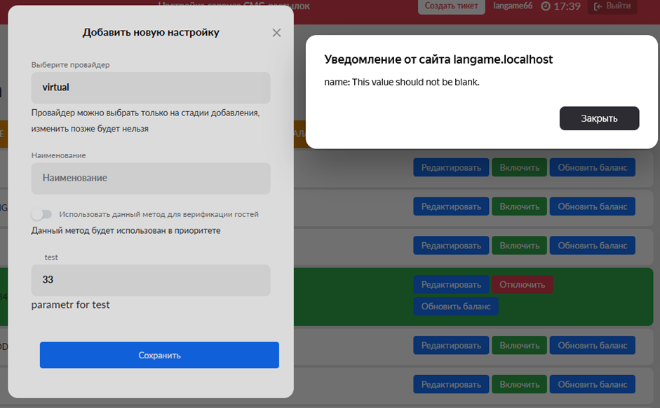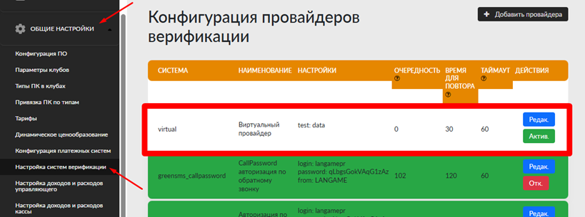 *Параметр “Использовать данный метод для верификации гостей”, то после добавления, в конфигурации провайдеров верификации, на странице «Настройка систем верификации» также появится настроенная конфигурация с очередностью -1000. Стоит отметить, что при включении данного флага всегда будет создаваться запись на странице “Конфигурация провайдеров верификации” привязанная к настройке сервиса СМС рассылки. При обновлении данных в настройке также будут обновлены данные в конфигурации провайдеров верификации. Если отключить настройку СМС рассылки, то и в конфигурация провайдеров верификации привязанная конфигурация будет отключена, если включить, то соответственно будет включена