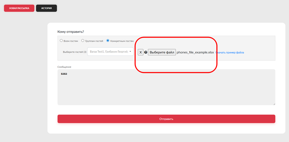 Также список гостей можно загрузить из xlsx файла, кликнув по кнопке "Выберите файл", файл может содержать телефоны гостей как в одну строку, так и в один столбец (вариант написания допускается и как +79999999999 и 79999999999 и 9999999999)