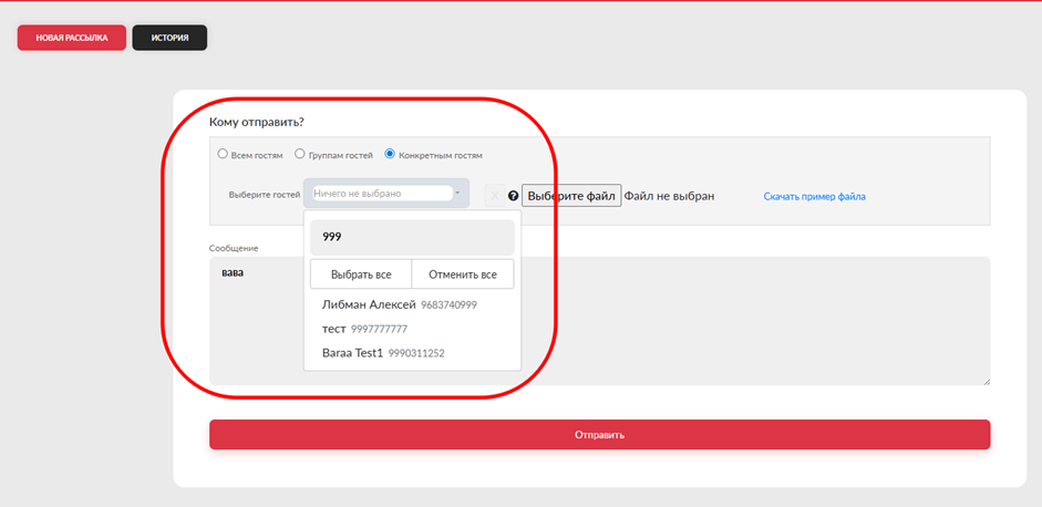 Конкретным гостям - рассылка будет отправлена конкретным гостям выбранным из выпадающего списка с поиском по номеру телефона