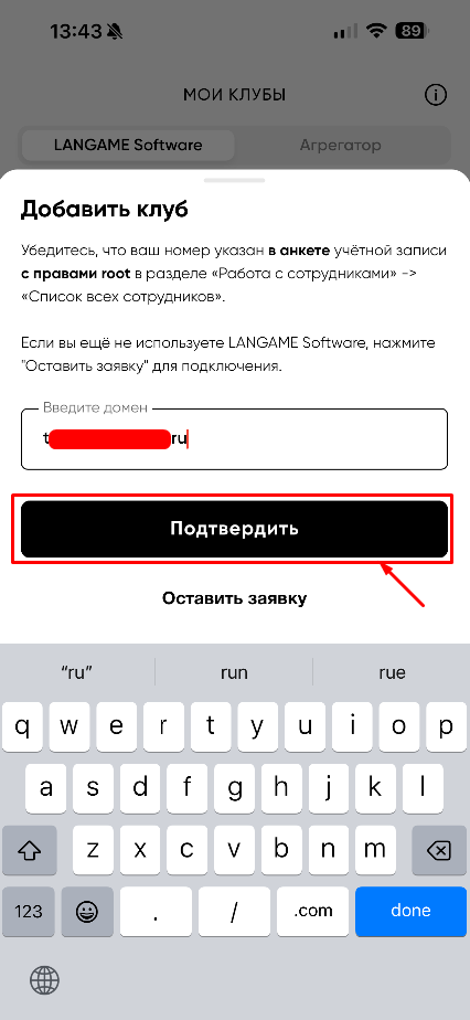 Для добавления клуба, нажимаем кнопку "Добавить клуб", в открывшемся окне вписываем домен нашего клуба и нажимаем "Подтвердить"