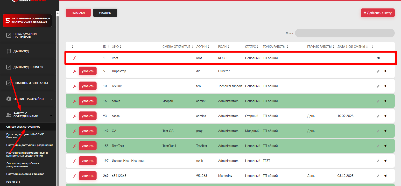 На домене переходим во вкладку "Работа с сотрудниками" на страницу "Список всех сотрудников"