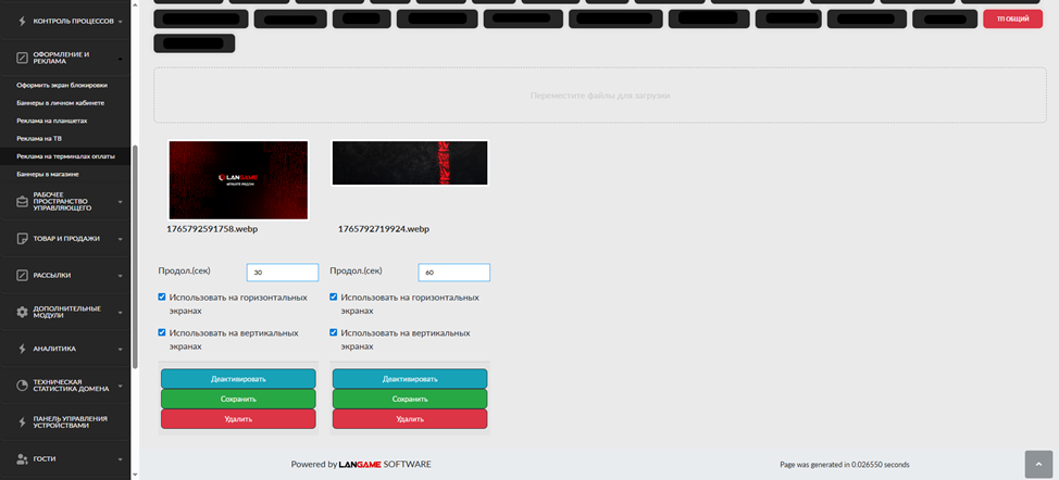 Рекламные материалы могут быть активированы/деактивированы, может быть настроена продолжительность при ротации рекламных материалов.