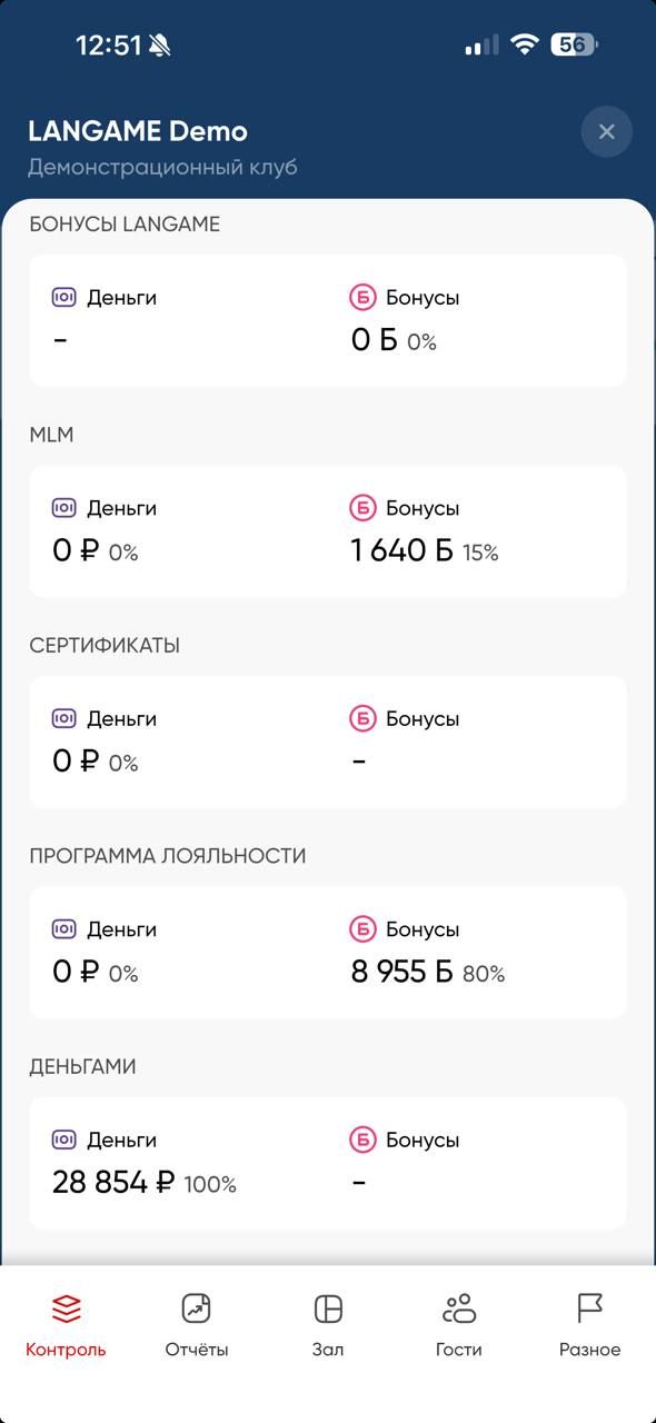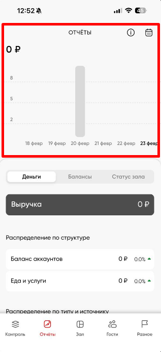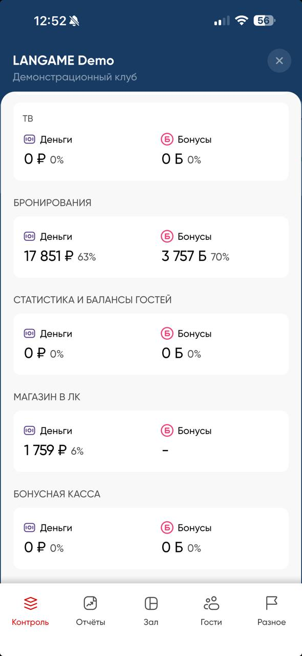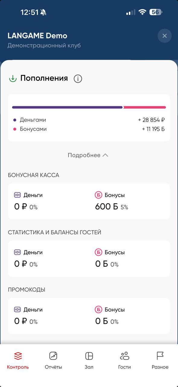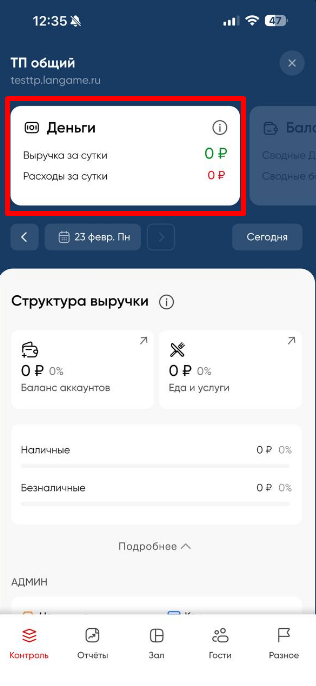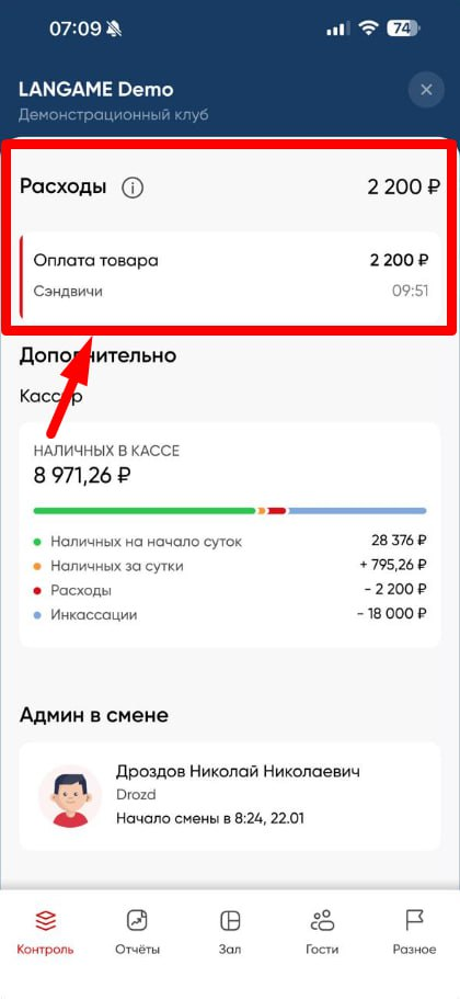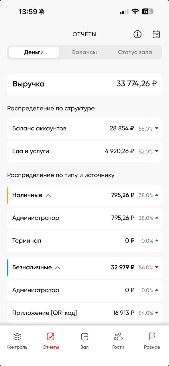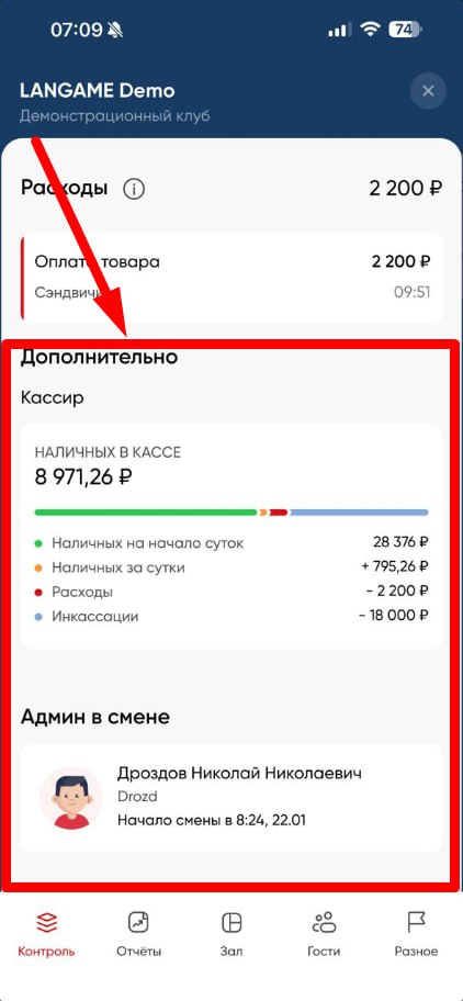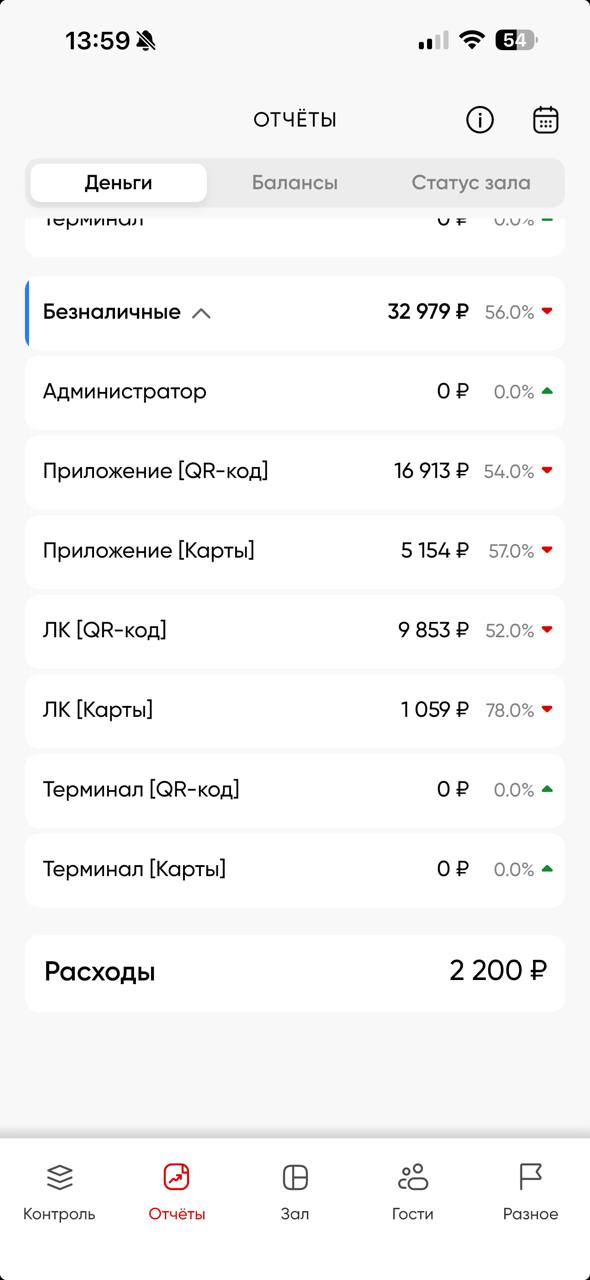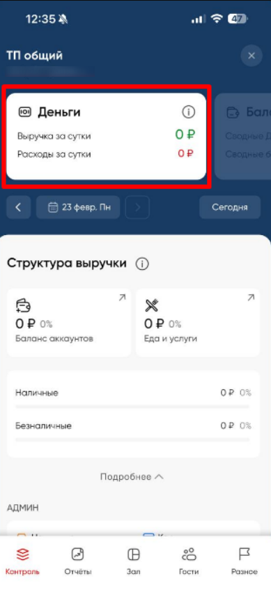 В этом разделе учитываются только «живые деньги» — средства, вырученные клубом на данный момент и в рамках текущих суток (с 00:00 до 23:59). Это наличные и безналичные платежи, проведённые через доступные в клубе способы оплаты