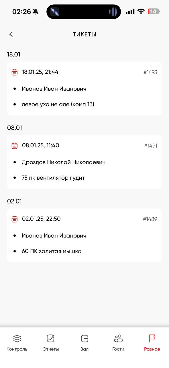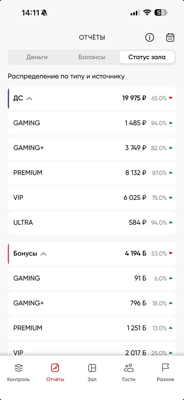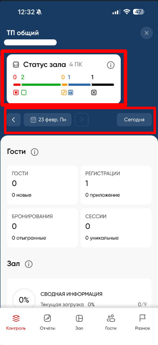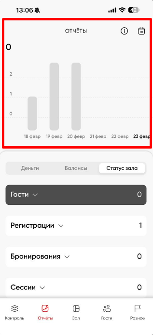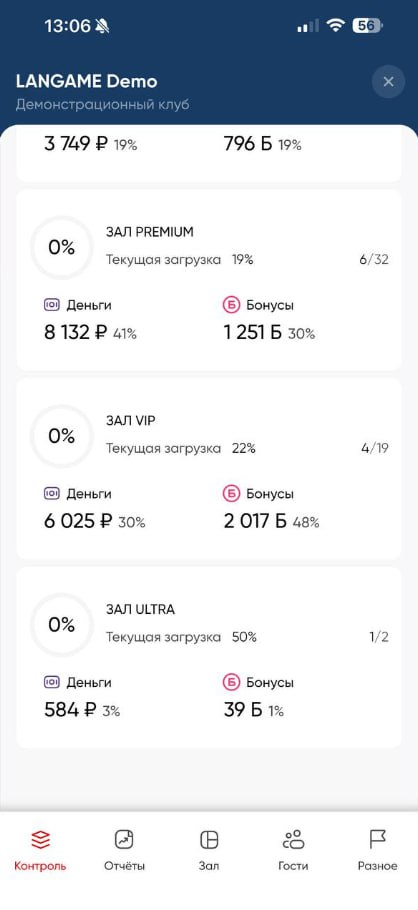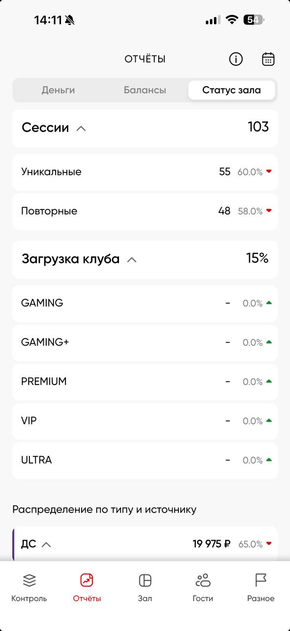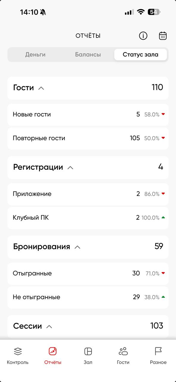 Статус зала - информация о статусе устройств и загрузке клуба на данный момент в рамках текущих суток [с 00:00 до 23:59]. Также содержит в себе отчеты: