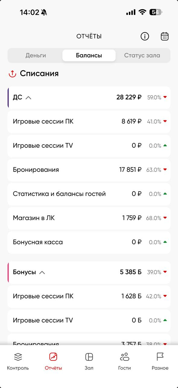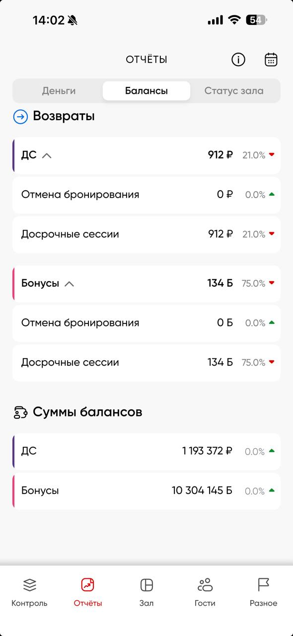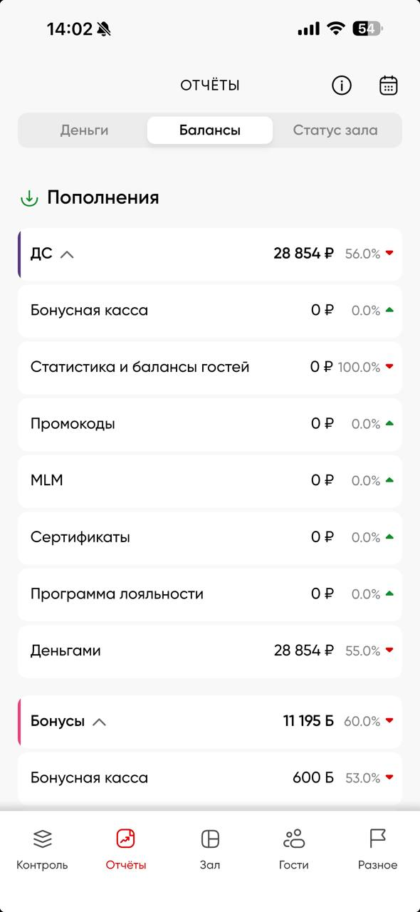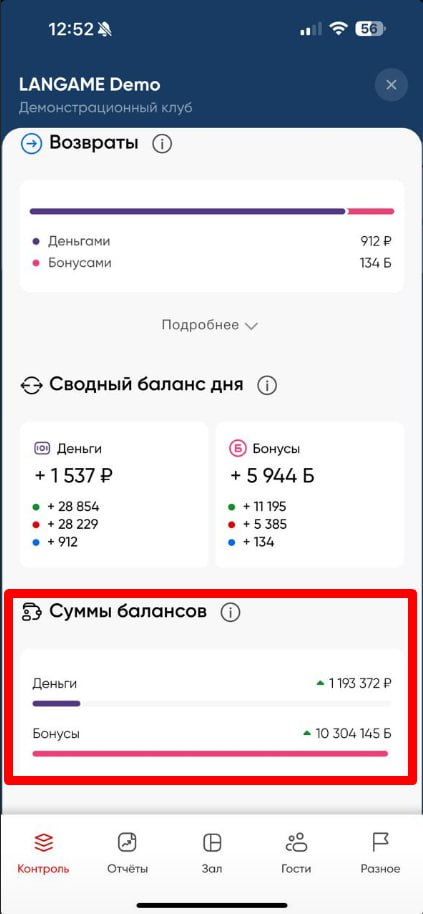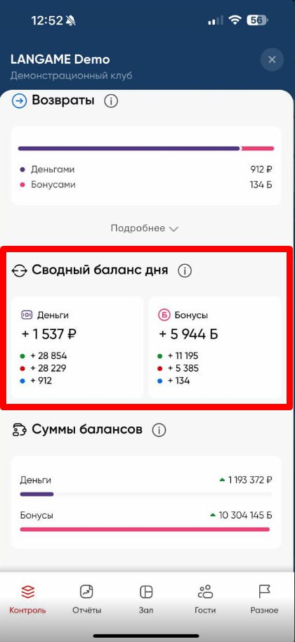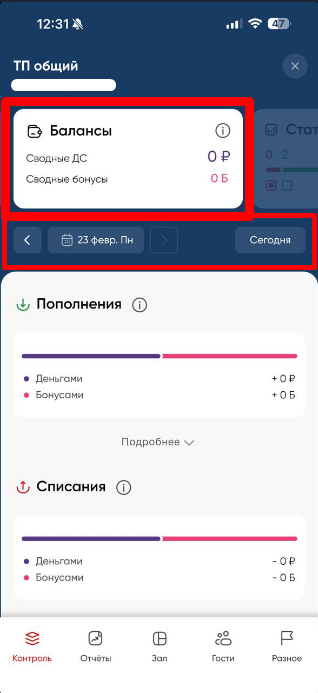 Балансы - информация обо всех балансовых движениях в рамках пополнений/списаний и возвратов (ДС) и бонусов на данный момент в рамках текущих суток [с 00:00 до 23:59]. Также содержит в себе отчеты: