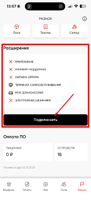 Последняя вкладка. Содержит в себе возможность подключить доп. услуги клуба, проверить логи ПК, тикеты и склад при необходимости