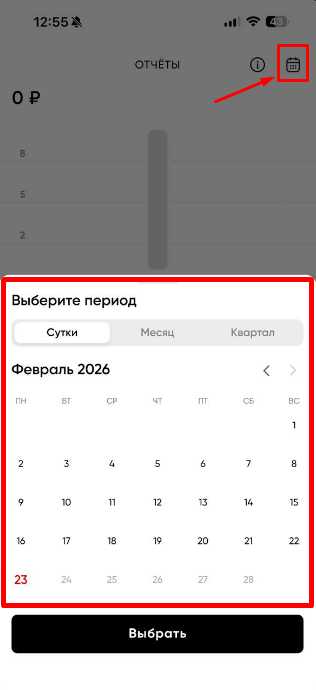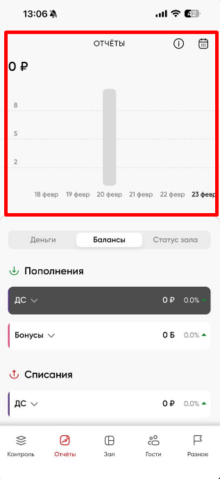 Свайпнув влево, мы перейдем в раздел Балансов, также ниже доступно изменение дат