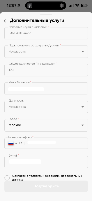 Доп. услуги - возможность запросить подключение дополнительных услуг предоставляемых в рамках поддержки клубов