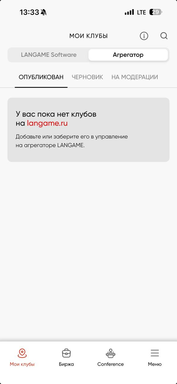 В данной вкладке мы можем увидеть две страницы LANGAME Software - все карточки наших клубов, которые мы добавили и Агрегатор - ваш клуб на агрегаторе langame.ru если клуб был добавлены в приложение