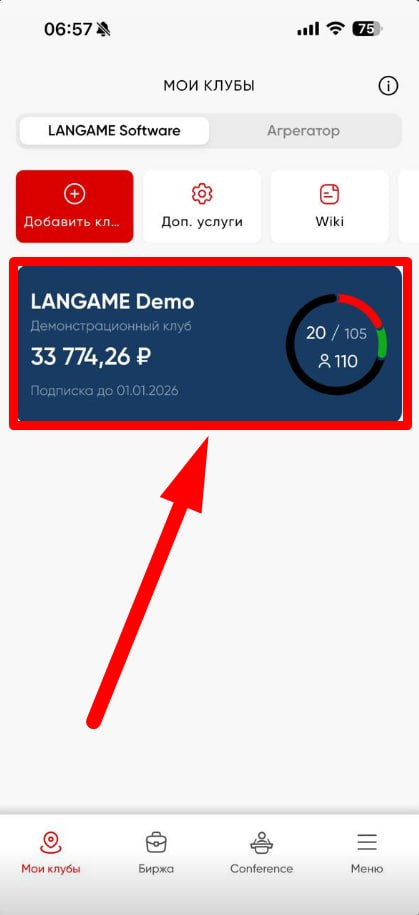 Переходим в сам клуб, нажав по карточке нашего клуба для отображения более детальной информацией по клубу. В нашем случае для примера будет демонстрационный клуб