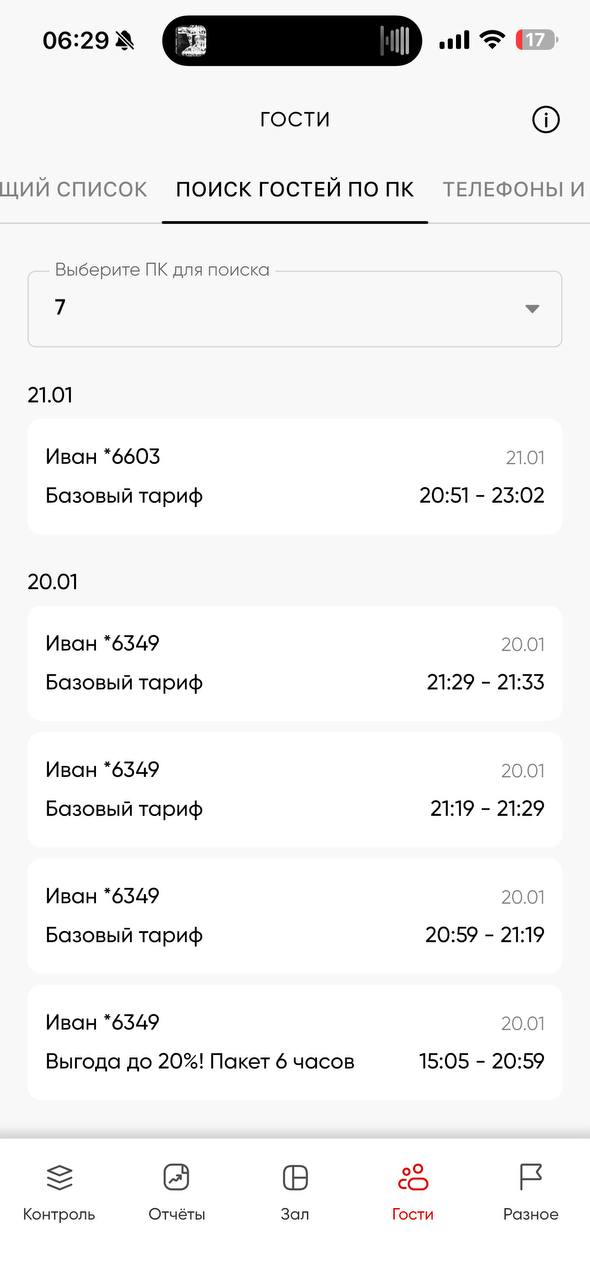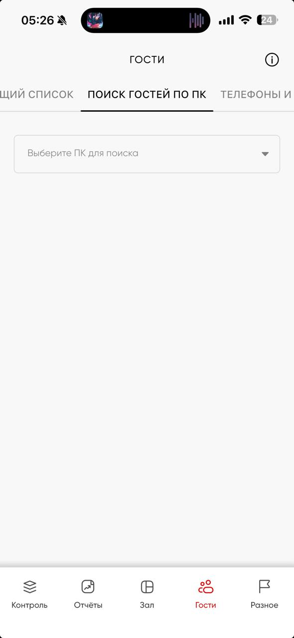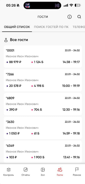 Следующая идет вкладка Гости. В этом меню доступна информация обо всех гостях клуба и взаимодействии с ними. Данная вкладка поделена на три блока Общий список, Поиск гостей по ПК и Телефоны и коды