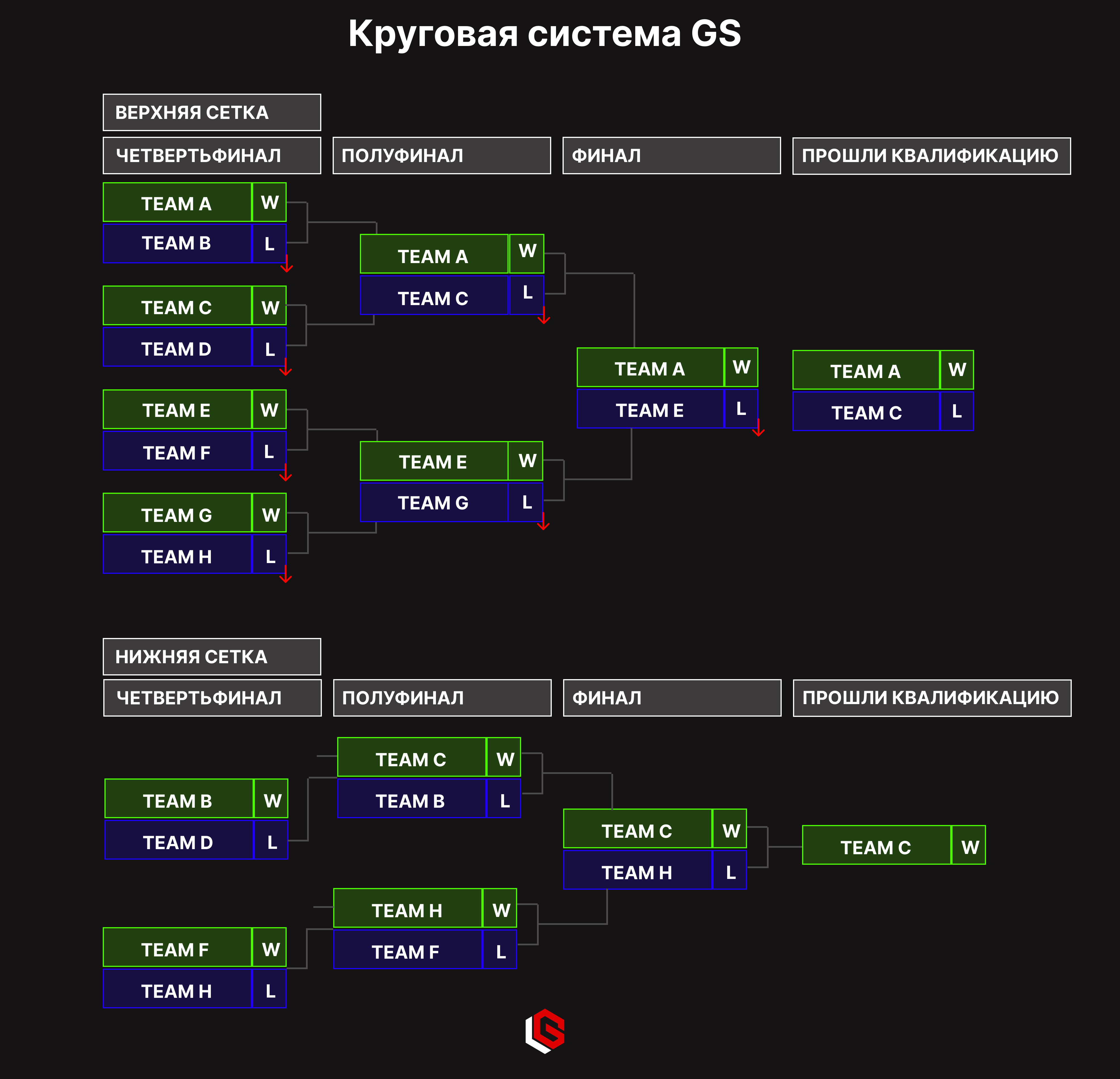 В формате GS команды сначала делятся на группы. Деление зависит от количества команд и числа групп, которое указал организатор. Внутри каждой группы команды играют между собой по круговой системе. Это значит, что результат турнира формируется по матчам внутри группы, а не по классической сетке на вылет.