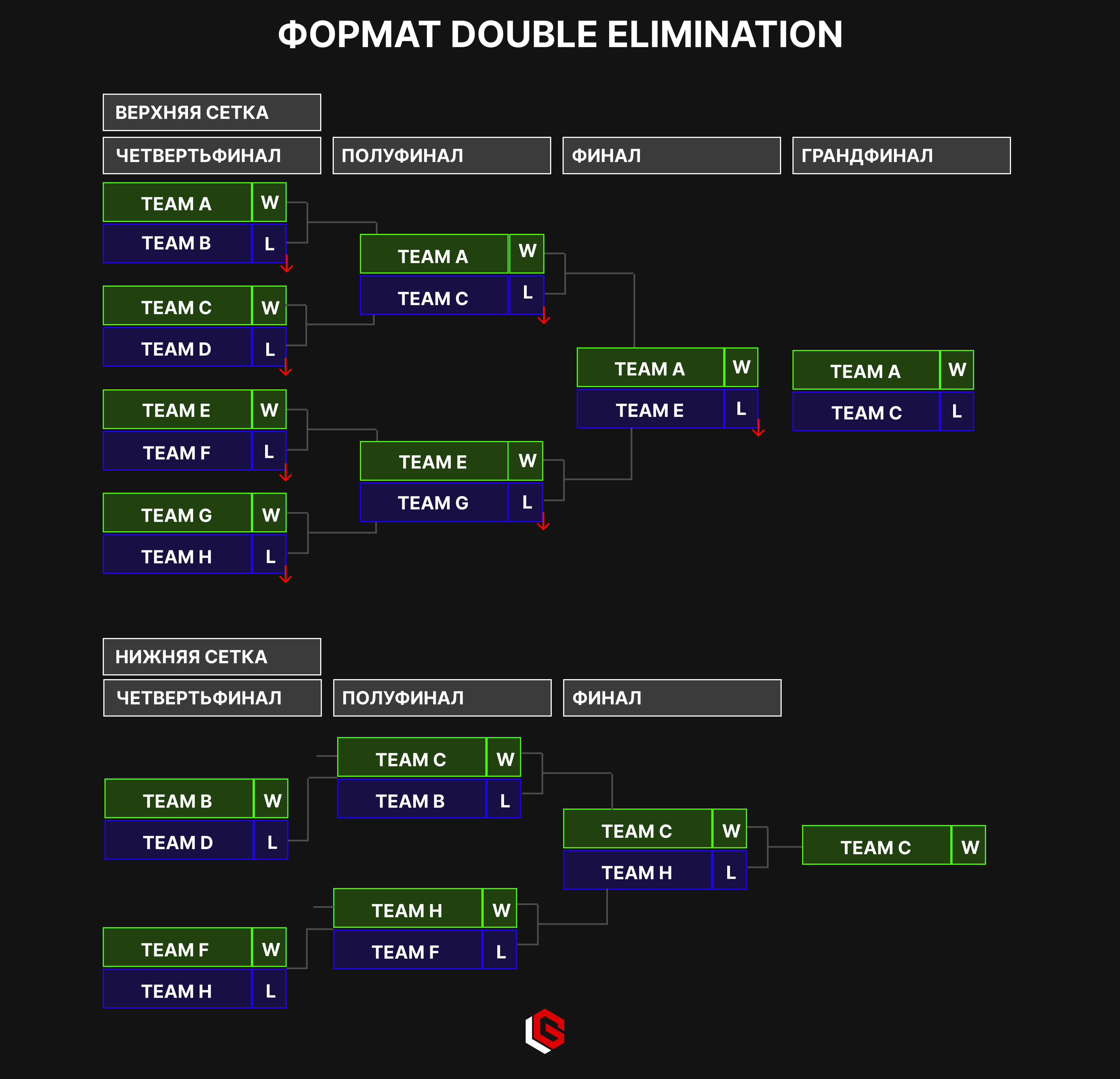 Это сетка с двойным выбыванием. После первого поражения команда переходит в нижнюю сетку. После второго поражения команда выбывает из турнира. Этот формат подходит, если вы хотите дать командам право на одну ошибку.