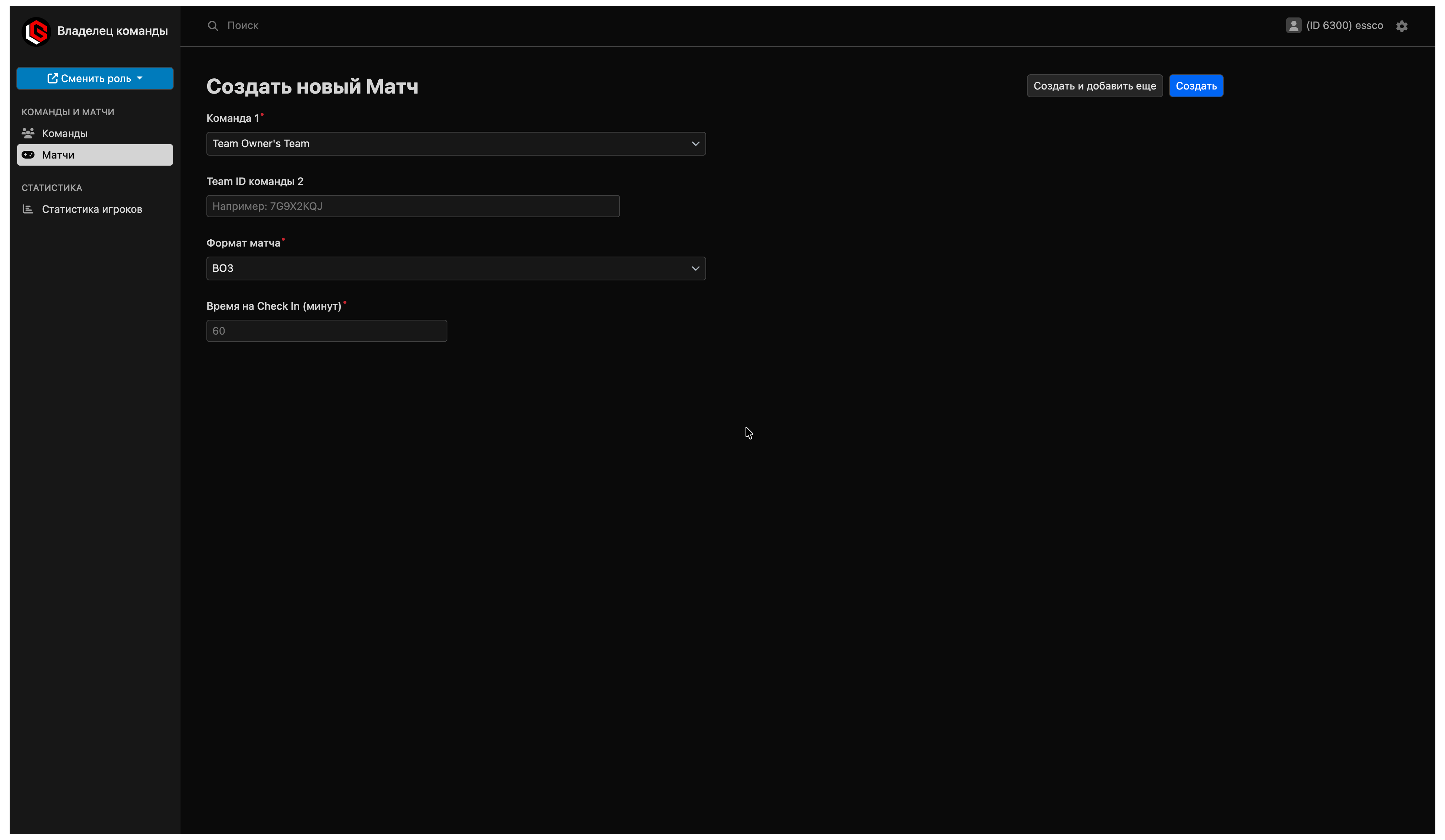 В разделе «Матчи» владелец команды работает только с матчами своих команд. Здесь он может создать новый матч, присоединить свою команду к уже существующему матчу и открыть лобби матча, чтобы посмотреть его статус и основную информацию по игре.